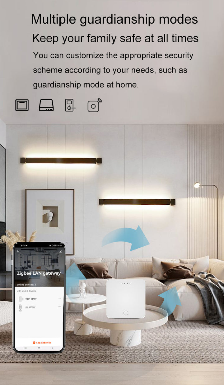 - DEVICE COMPATIBILITY: Controls various smart devices including switches, lamps, curtains, door sensors, and temperature sensors through one central hub